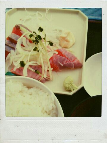 帰りがけに食べたお昼は超ガッツリの「サーモンのさしみ定食」。